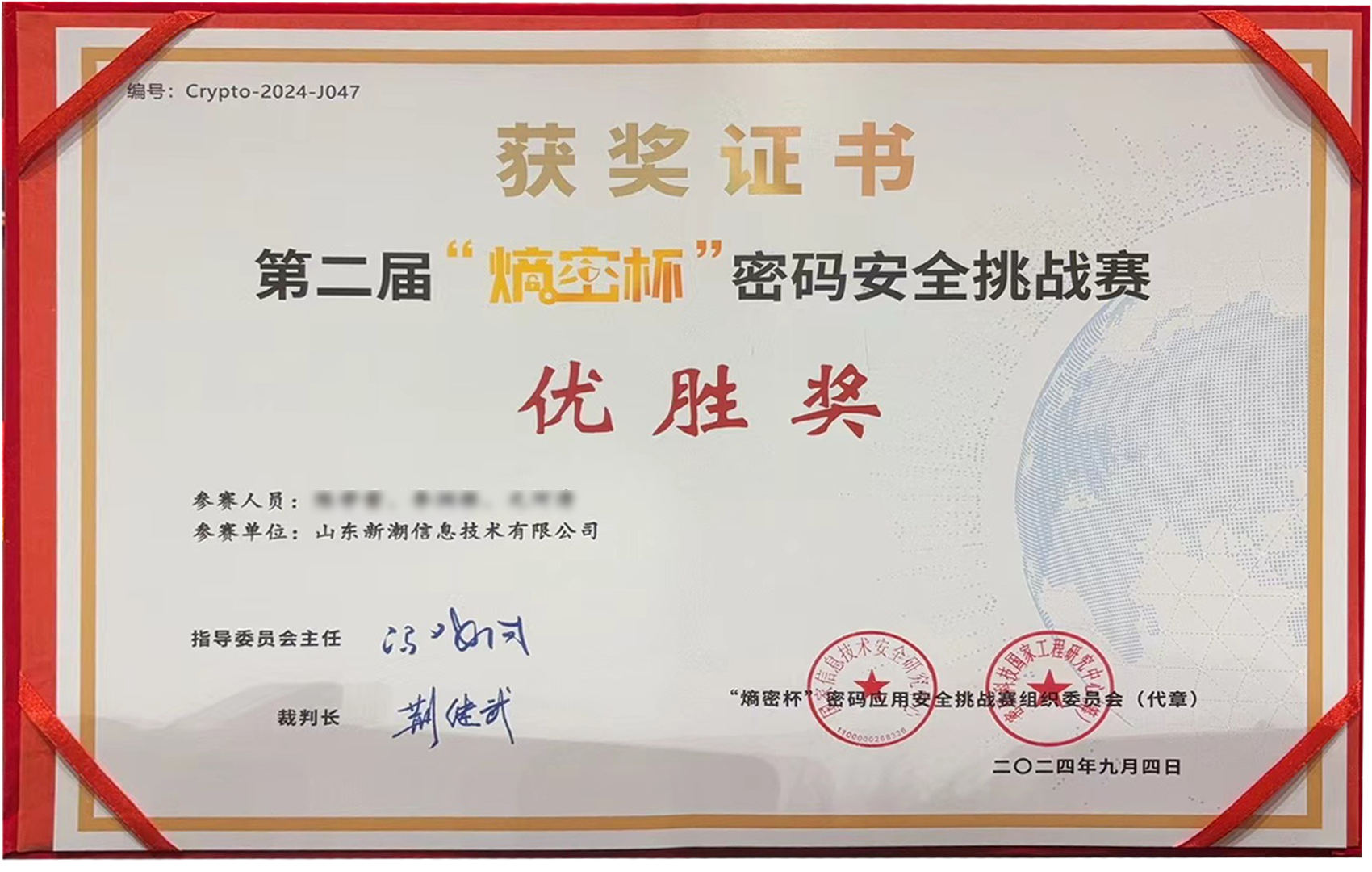 新潮信息組建的“迷蹤尋徑”戰(zhàn)隊,榮獲本次大賽的“優(yōu)勝獎”,展現(xiàn)了新潮信息在密碼領域的專業(yè)素養(yǎng)和綜合實力。