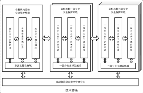 技術(shù)體系:參考《信息安全技術(shù) 信息系統(tǒng)等級保護(hù)安全設(shè)計技術(shù)要求》(GB/T 25070-2010)的安全域模型,將“安全域縱深防護(hù)”、“多層次立體防御” 和“信息安全等級保護(hù)”等安全防護(hù)思想相結(jié)合,建立金融行業(yè)信息安全保障技術(shù)體系模型。依據(jù)金融行業(yè)的組織結(jié)構(gòu)、網(wǎng)絡(luò)架構(gòu)將每個機構(gòu)作為一個整體保護(hù)對象,設(shè)計金融機構(gòu)信息安全保障框架,總部和各個分支機構(gòu)都是獨立的安全域,每個安全域又細(xì)分計算環(huán)境域、區(qū)域邊界、通信網(wǎng)絡(luò)和支撐設(shè)施域。