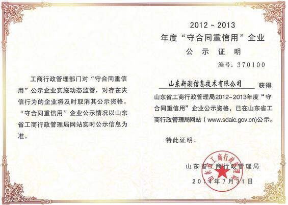 山東新潮信息技術(shù)有限公司多年來堅持誠信履約、守法經(jīng)營,為推進省內(nèi)企業(yè)誠信建設、規(guī)范企業(yè)合同行為做出了貢獻。經(jīng)山東省工商行政管理局嚴格審核,成為2012—2013年度“守合同重信用”企業(yè)。