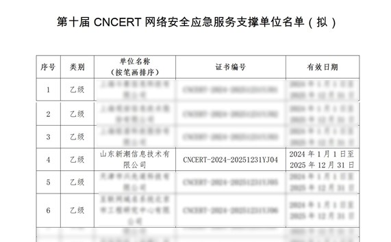 為加強網絡安全應急技術協(xié)作體系建設,提升重大突發(fā)網絡安全事件應對和保障能力,根據(jù)申報單位綜合能力及支撐國家計算機網絡應急技術處理協(xié)調中心網絡安全工作情況,經自主申報、形式審核、專家評審、研究確認等環(huán)節(jié),山東新潮信息技術有限公司再次作為山東省唯一入選單位,被遴選為第十屆CNCERT網絡安全應急服務支撐單位(全國共59家)。